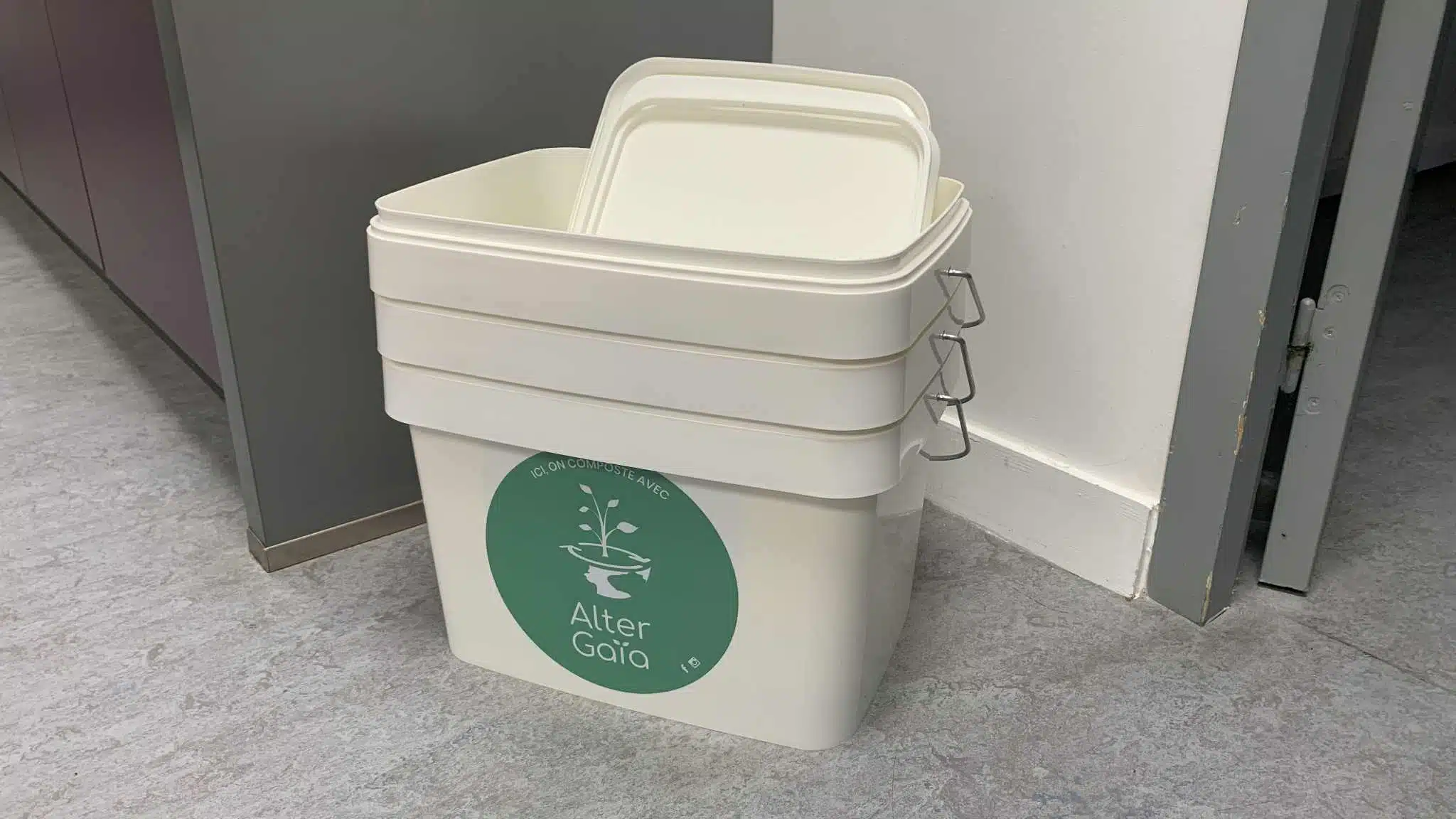 Trois bioseaux Alter Gaia installés dans la cuisine de l’institut Techni’Sens à La Rochelle.
